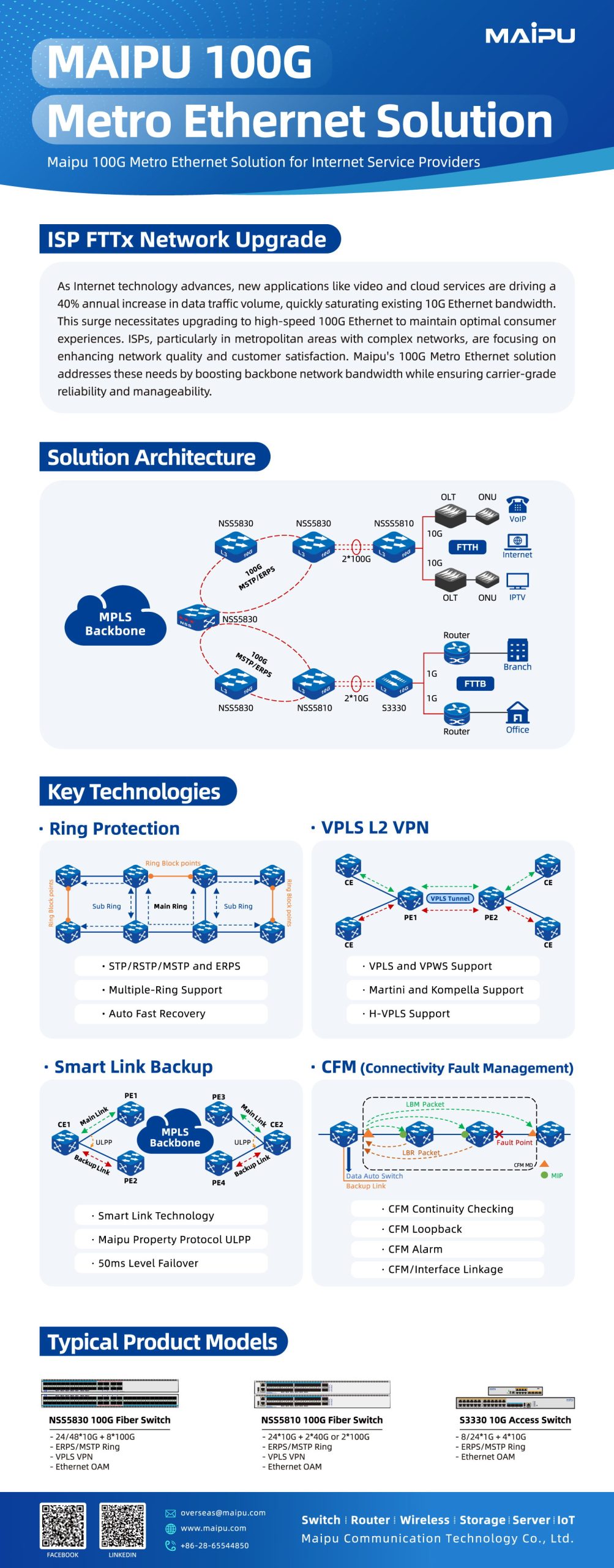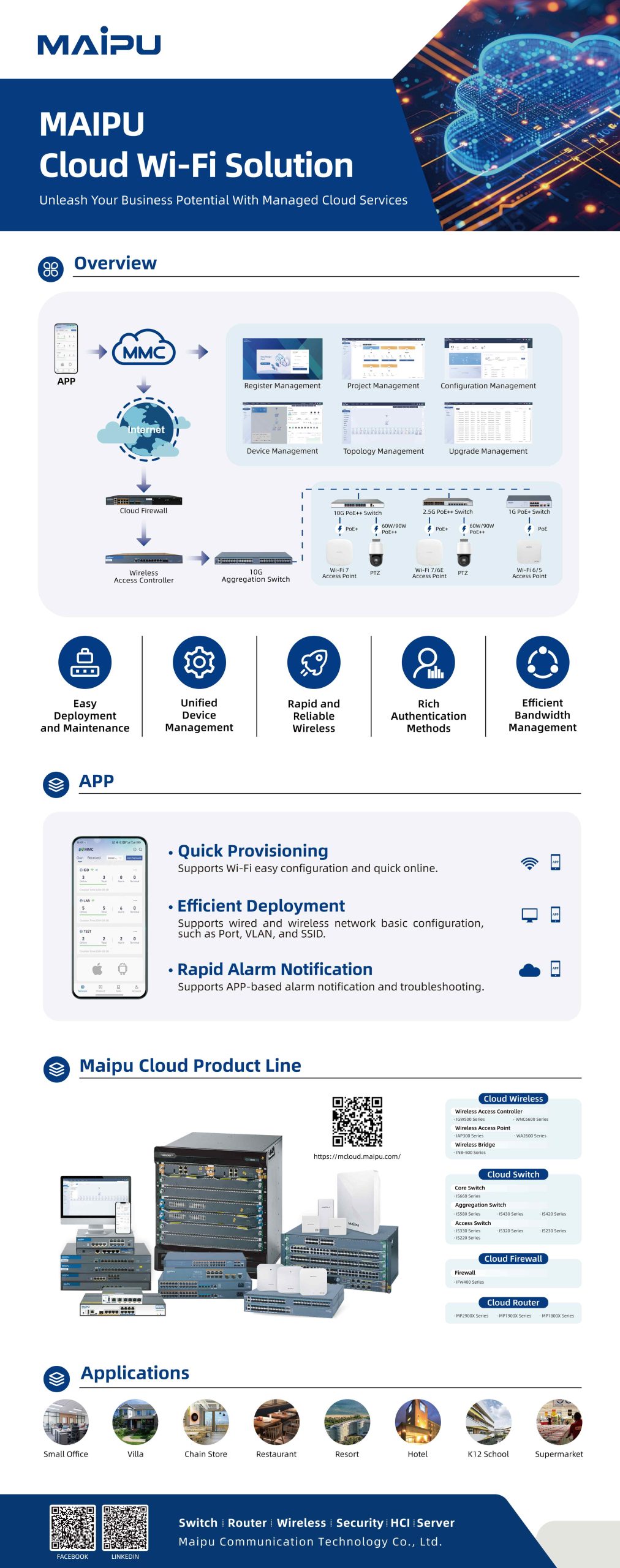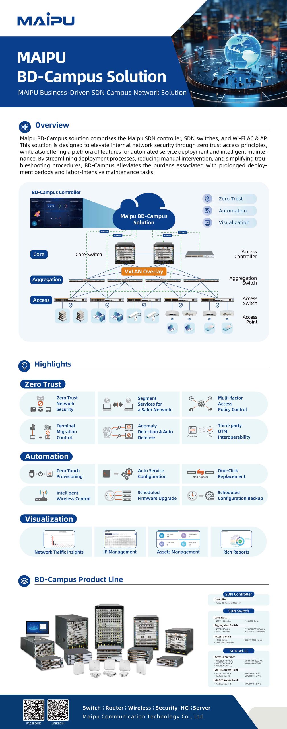 Maipu Communication Technology, founded in 1993, is a leading networking solutions provider in China. With strong R&D capabilities, over 1,500 staff, and global deployment in 60+ countries, Maipu delivers high-quality, innovative network infrastructure guided by its vision to “Make IT Intelligent.”